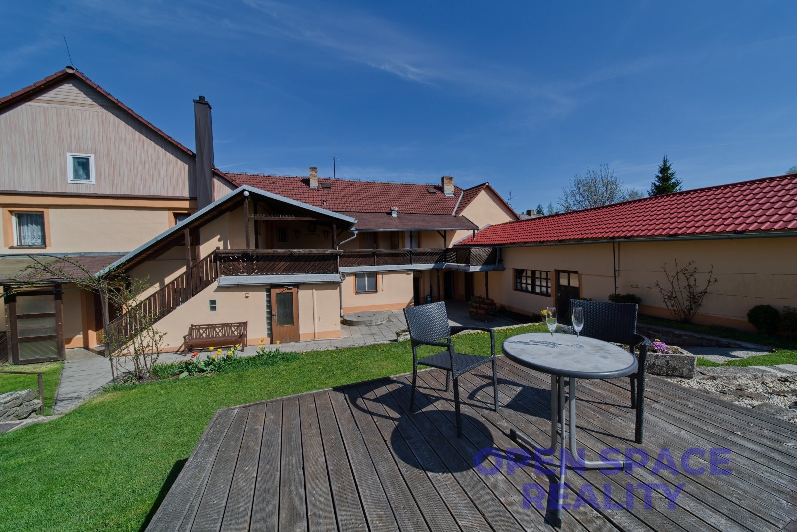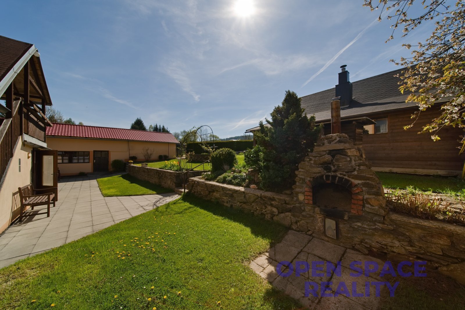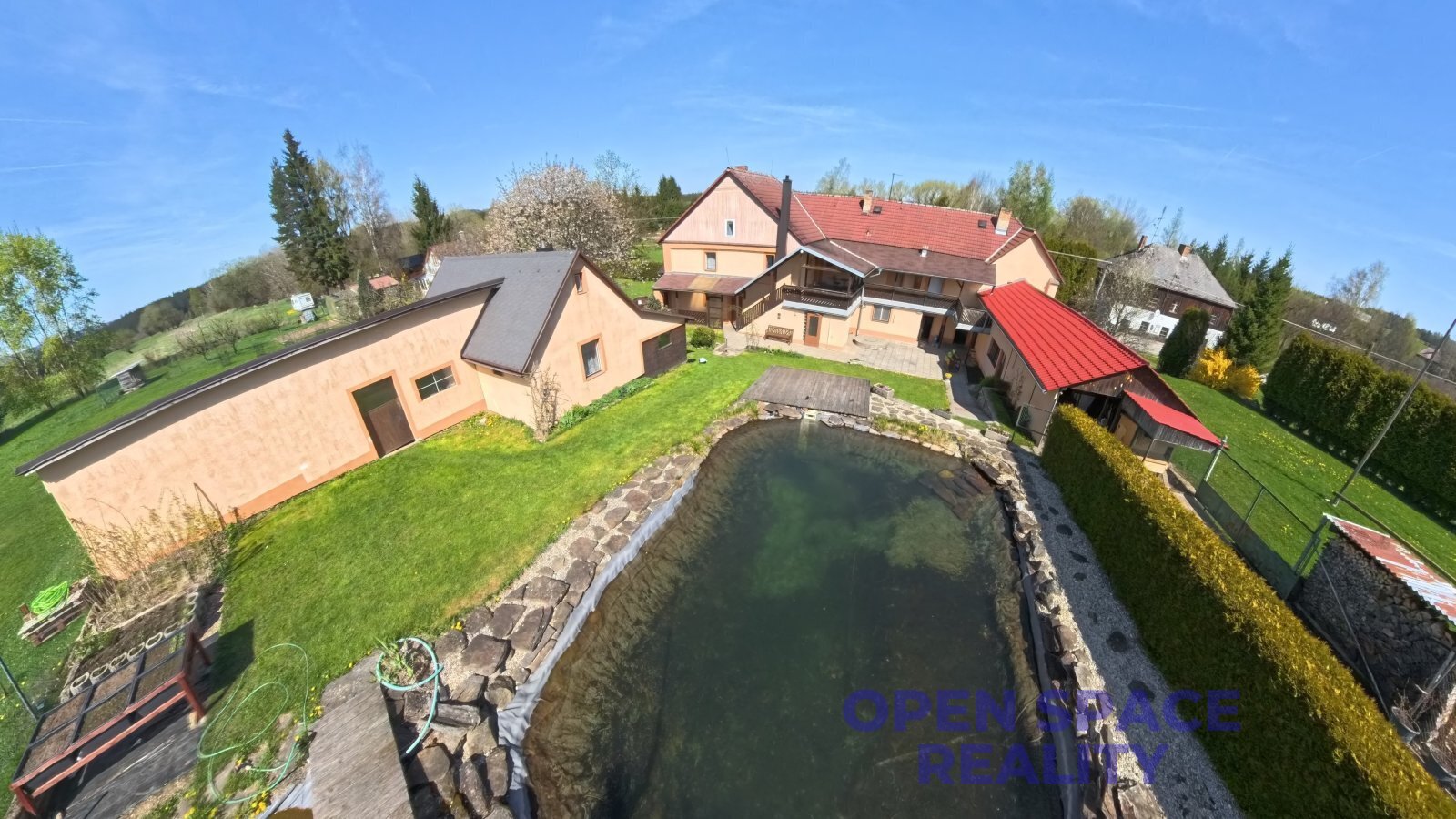 - tři kryté terasy, zahrada, venkovní krb, koupací jezírko